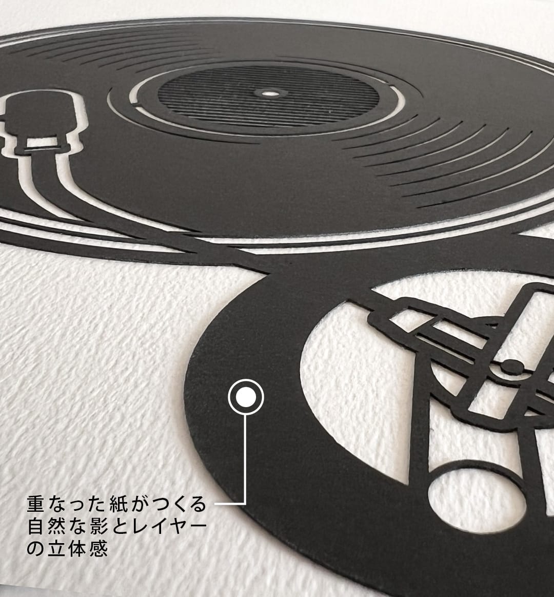 LPレコードプレイヤーを真上から切り取った構図をモチーフにした、レトロ&モダンなムードの作品です。デジタル全盛のいま、アナログが持つ温かみや、ゆっくりと針を落とす所作そのものの心地よさに着目し、80年代の雰囲気をシンプルな造形で表現しました。