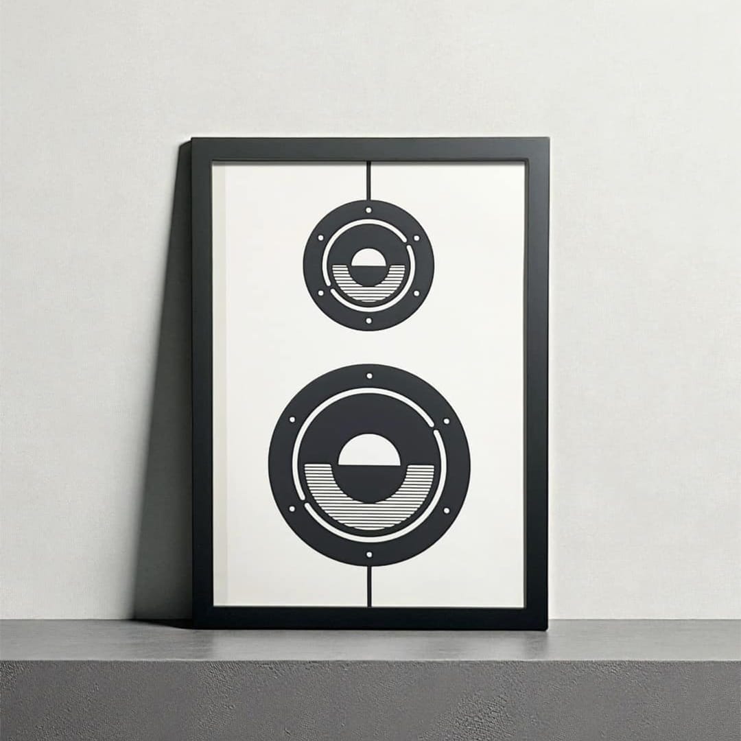 本物のスピーカーを置けない空間にも、この作品を飾ることで音のある気配を自然と添えてくれます。無駄を削ぎ落としたミニマルなデザインで幅広いインテリアスタイルと調和し、他のアートフレームとも組み合わせやすく、空間全体のムードづくりに最適です。