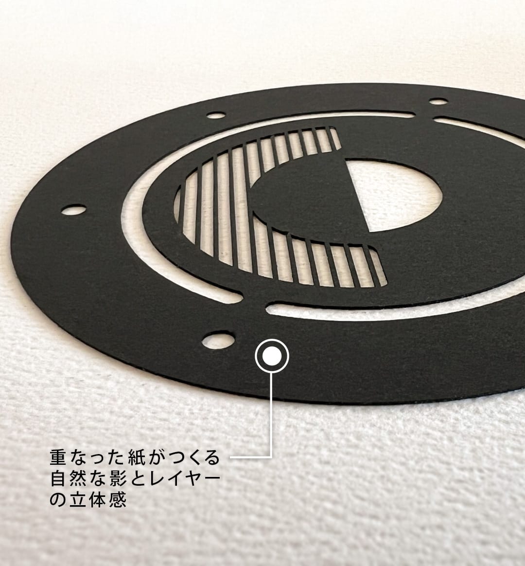 オーディオスピーカーの造形をモチーフにした、モダンな作品です。スピーカーのガスケットや振動板、ダストキャップなどのパーツの美しさに着目し、そのシルエットをグラフィカルに再構成しました。