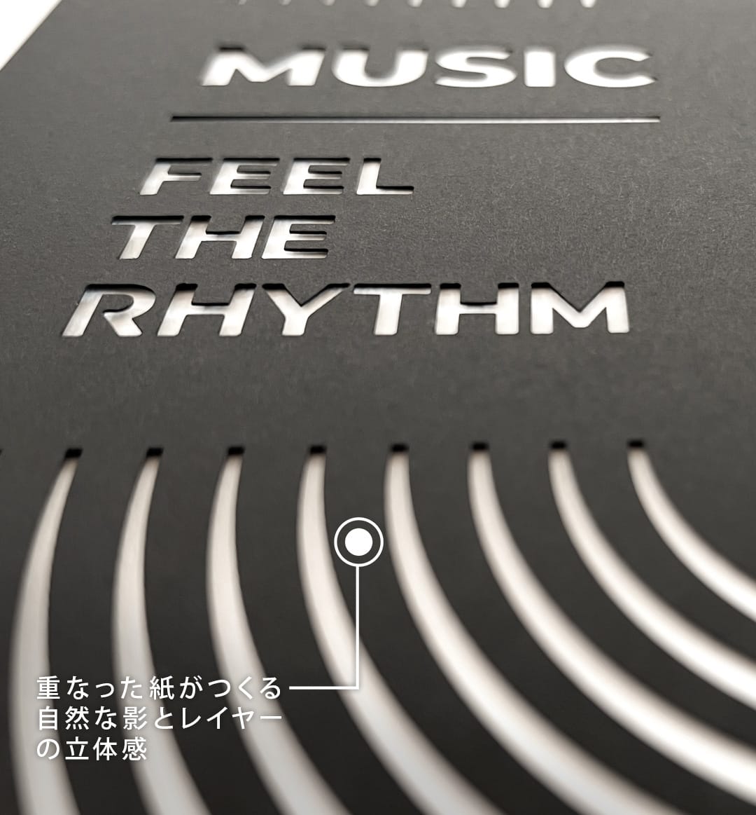 音が広がる波紋をモチーフに、紙のレイヤーとラインでグラフィカルに構成した作品です。音が静かに満ちていく感覚を視覚的に表現しました。スピーカーから広がる気配を、シンプルな造形に落とし込んでいます。