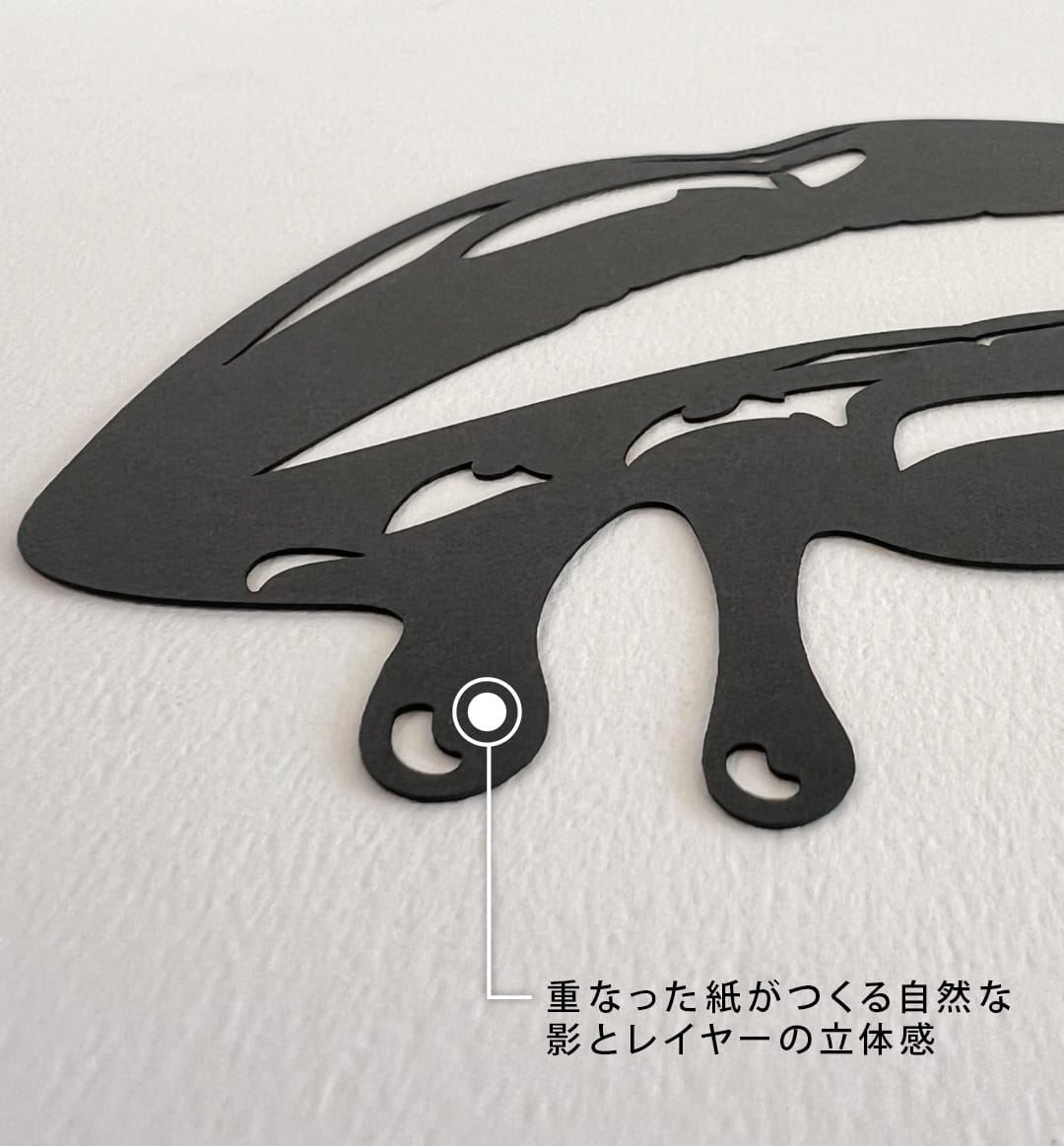 手作業で丁寧に塗装した、マットな質感の木製フレーム。ほのかに木柄が映る、程よい厚みのある仕上がりです。数多くの試作から選び抜いた紙を使用し、立体感と陰影を引き出した切り絵アート。