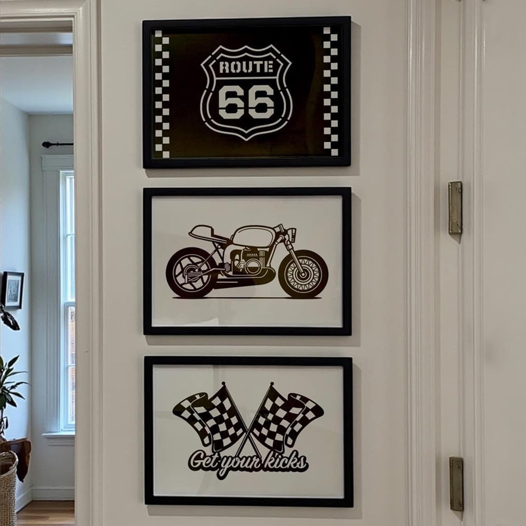 伝説的なハイウェイを象徴する No.029 Route 66、機能美を凝縮したバイクの姿を描く No.030 Cafe Racer、自由とスピードを表現した No.031 Get your kicks。それぞれが異なる要素を持ちながら、「道」と「移動」をゆるやかにつなげています。サインの形、車体のライン、タイポグラフィの表情。視覚的な記号が重なり合うことで、軽快な流れと奥行きが生まれ、アメリカンロードカルチャー特有の空気が立ち上がります。主張しすぎない構成でインダストリアルからカジュアルまで幅広い空間に取り入れやすいのも特徴です。